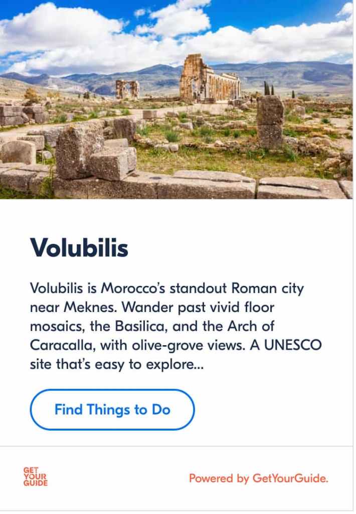 - GetYourGuide – Volubilis Day Trips: For booking guided tours from Fez or Meknes, including transportation and an English-speaking guide.