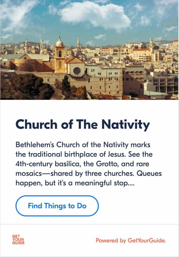 - GetYourGuide – Bethlehem Tours: A platform offering guided tours from Jerusalem and Bethlehem for a seamless experience.
