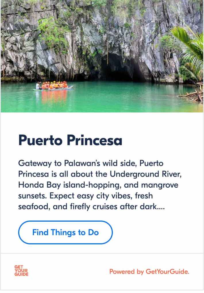 • Lodging: The city has extensive options, from high-end resorts like Princesa Garden Island Resort to boutique stays like Hotel Centro. Most travelers arrive a day early to stay overnight before embarking on their boat.